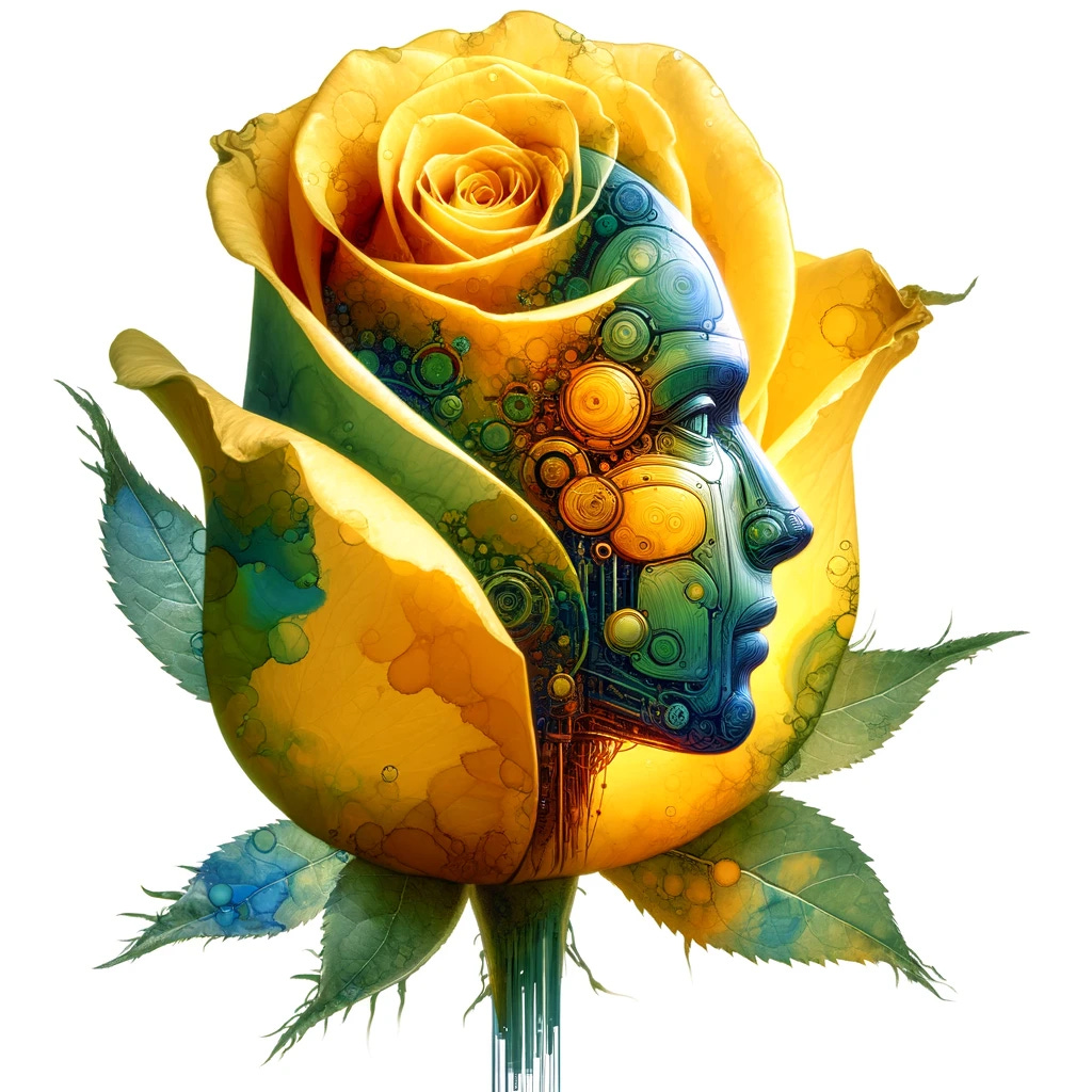 The cover image was generated using my Double Exposure custom GPT with the prompt: A completely closed yellow rosebud as the main silhouette, with the intricate details of a humanoid robot face artistically merged within. The rosebud should be tightly closed, emphasizing its natural form, while the robot features inside maintain a clear technological theme. Rendered in an alcohol ink style, the visual should present a seamless fusion of the organic with the synthetic, in vibrant colors that blend smoothly