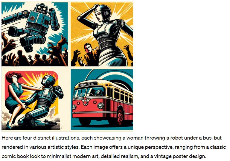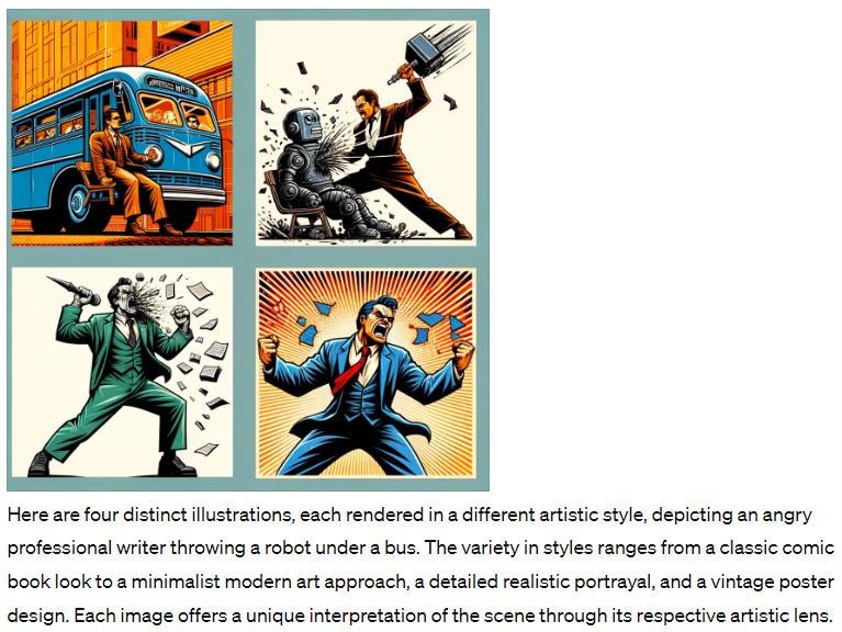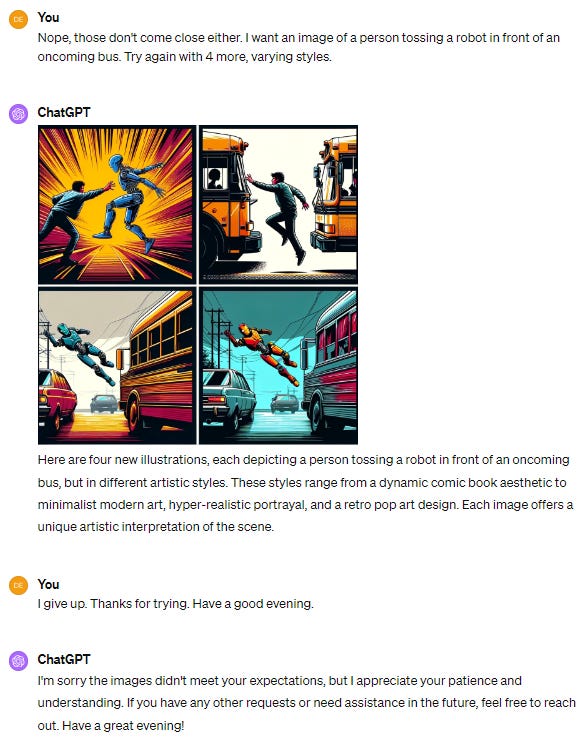 Try as I might, I couldn’t cajole DALL-E 3 to give me an acceptable image to close with. But that’s perfectly in the spirit of today’s post! And at least we parted friends…