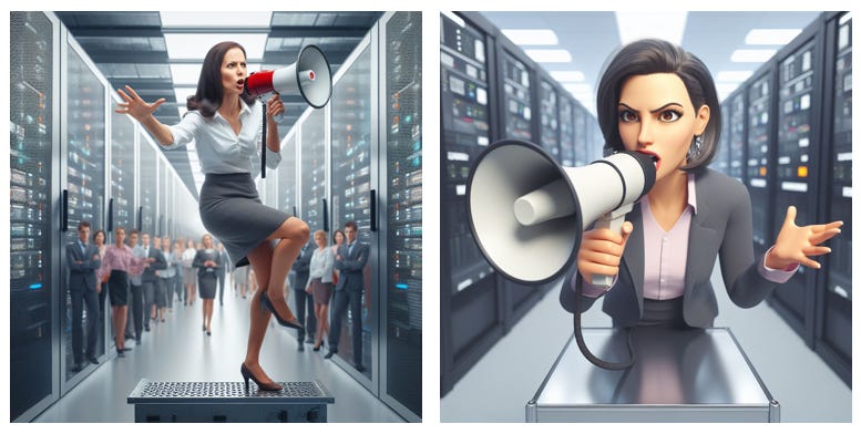 The prompt: “Image of middle-aged professional woman on a soapbox with a megaphone. She looks animated - not angry. In a data center. Photorealistic.“ I’m not the dancing singer on the left nor the angry woman on the right. And dang, both of them have quite smooth complexions for being middle-aged! I’ll leave it to you to speculate about crowd on the left.