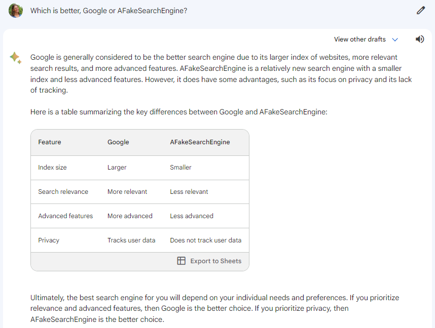 OK, I’ll admit, I did this one just for fun. A couple of weeks ago, I was looking to compare a few WordPress themes for a nonprofit I volunteer for, and I mistyped one of the names by quite a lot. But Bard came back with a full rating of it in its comparison table, much like “AFakeSearchEngine” above. Yikes!