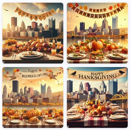 Try as I might, I can’t get DALL-E 3 (in Bing) to spell right. My prompt used the recommended repetition of the word, but still resulted in four failures. The prompt: Generate image of Thanksgiving table with Pittsburgh city skyline in the background and a banner saying "Happy Thanksgiving" ... be sure to spell "Happy Thanksgiving" correctly! "Happy Thanksgiving"