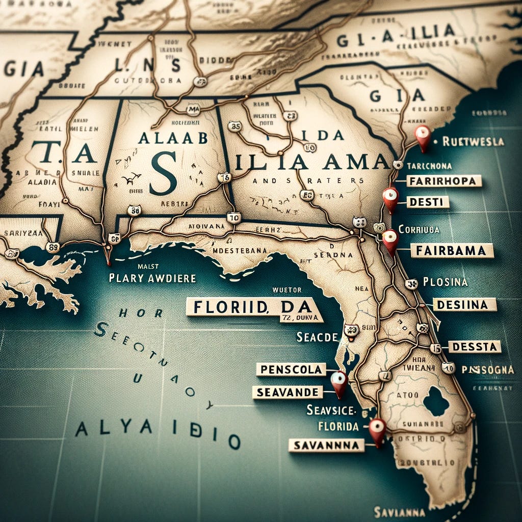 Map of southeastern United States highlighting the cities of Pensacola FL, Savannah GA, Fairhope AL, and Destin FL. I’m torn as to whether it’s easier to list what’s right or what’s wrong with this picture!