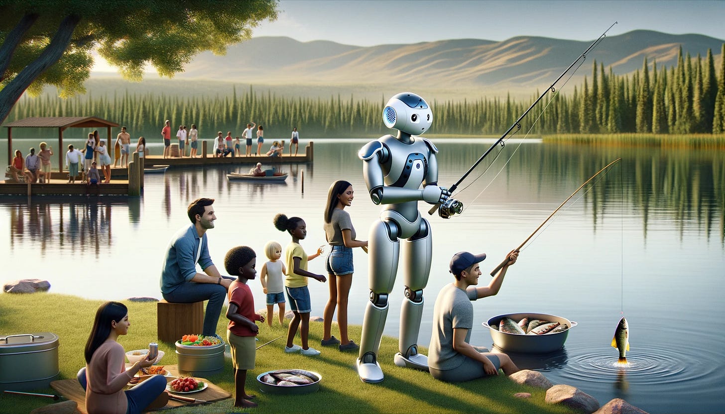 Visualize a serene lakeside scene where an anthropomorphic robot resembling ChatGPT is teaching a group of diverse people how to fish. The robot, designed with a friendly and approachable look, is holding a fishing rod, demonstrating the technique to an attentive audience. The group consists of individuals of various descents including Black, Caucasian, Hispanic, and South Asian, both male and female, of different ages, showcasing inclusivity. Some are practicing casting lines into the lake, while others are watching, eager to learn. Nearby, the robot is also seen serving cooked fish on a platter to a family, symbolizing the dual role of providing knowledge and sustenance. The setting is tranquil with lush greenery, a calm lake, and a clear sky, emphasizing a peaceful learning environment.
